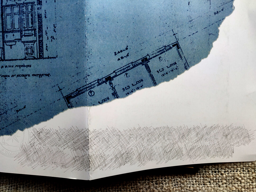 I remembered that the notebook Rose gave me included a piece of information I already had, which is the partial architectural plan, so I checked it again thoroughly and I found an extra information. Someone actually wrote on a paper while it was on top of the plan, and it left some marks on the map. I just used a pencil (classic I know) to highlight the indent left on the paper. Can you read it?