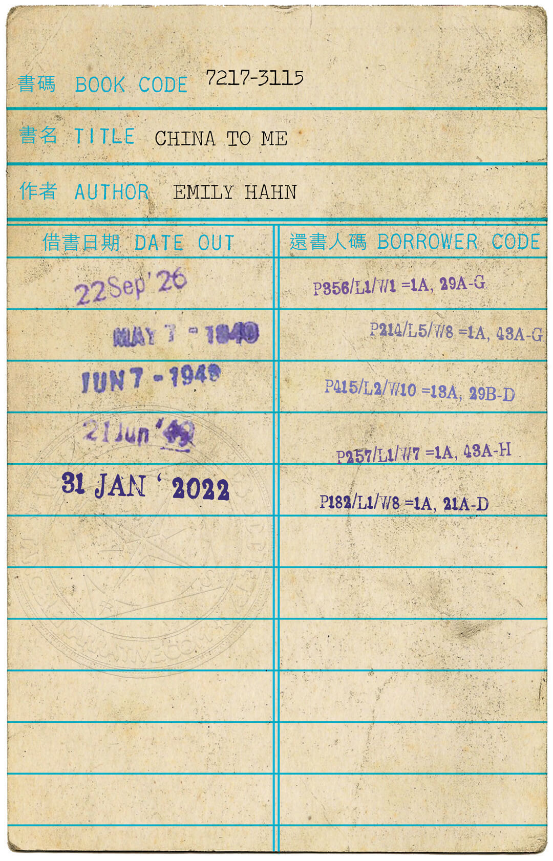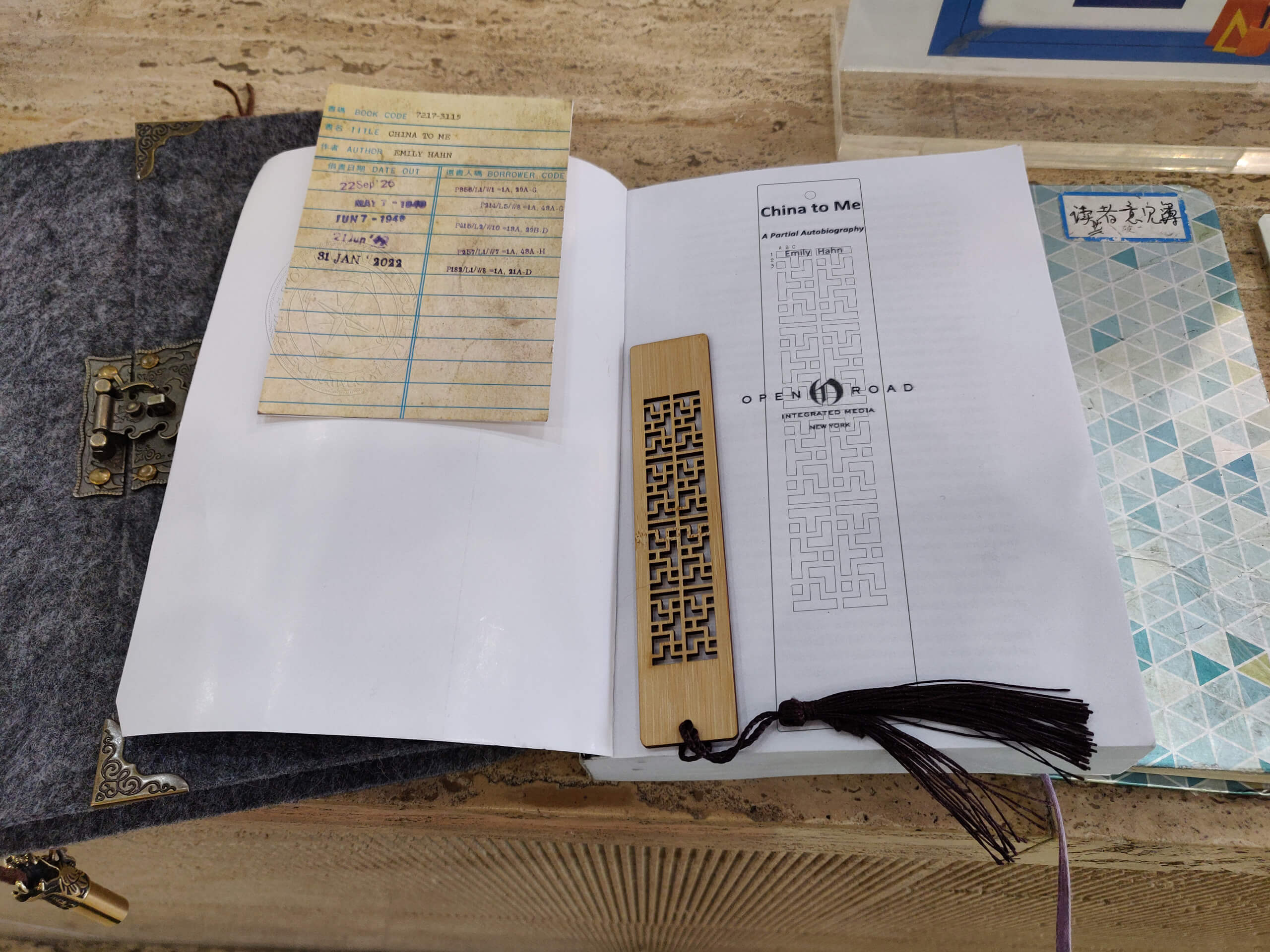 It is actually the library card for the book “China to me” on one side, and strangely enough a postcard is on the other side. So, I decided to rent the book “China to me” and take it back home. The librarian was kind enough to offer me a bookmark.