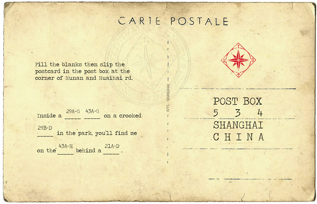 Can you help me fill in the missing information on the postcard? If you need me to check anything in the book, please let me know. But beforehand let me know your thought process and let me know what I should do. We need to work closely together on this one.